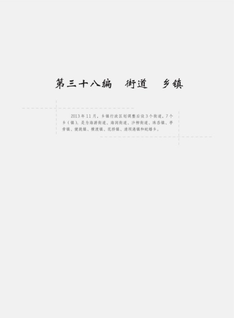 第三十八编 街道 乡镇 2013 年 11 月,乡镇行政区划调整后设 3 个街道,7 个 乡(镇)。是为海游街道、海润街道、沙柳街道、珠岙镇、亭 旁镇、健跳镇、横渡镇、花桥镇、浦坝港镇和蛇蟠乡。
