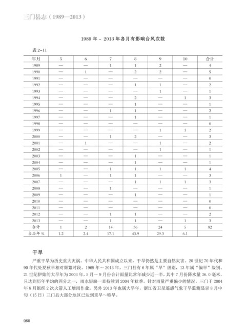 90 年代处夏秋旱相对频繁时段。1969 年~ 2013 年,三门县有 6 年属“旱”级别,13 年属“偏旱”级别。