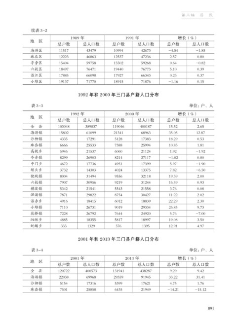 1992 年和 2000 年三门县户籍人口分布