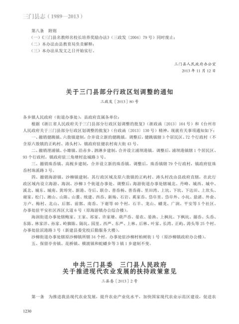 根据《浙江省人民政府关于三门县部分行政区划调整的批复》(浙政函〔2013〕164 号)和《台州市