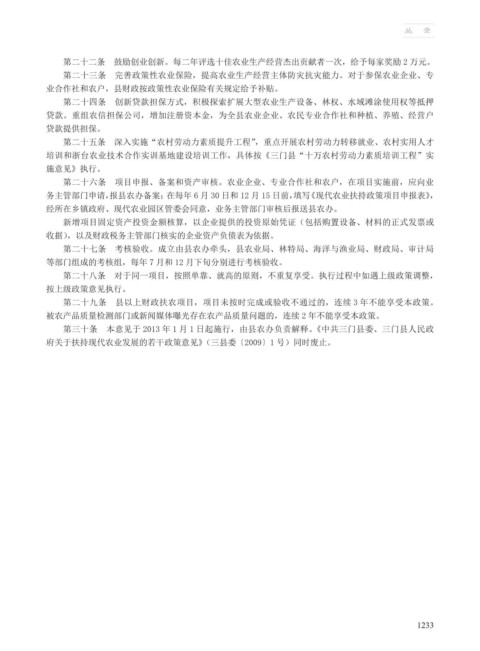 第三十条 本意见于 2013 年 1 月 1 日起施行,由县农办负责解释。《中共三门县委、三门县人民政