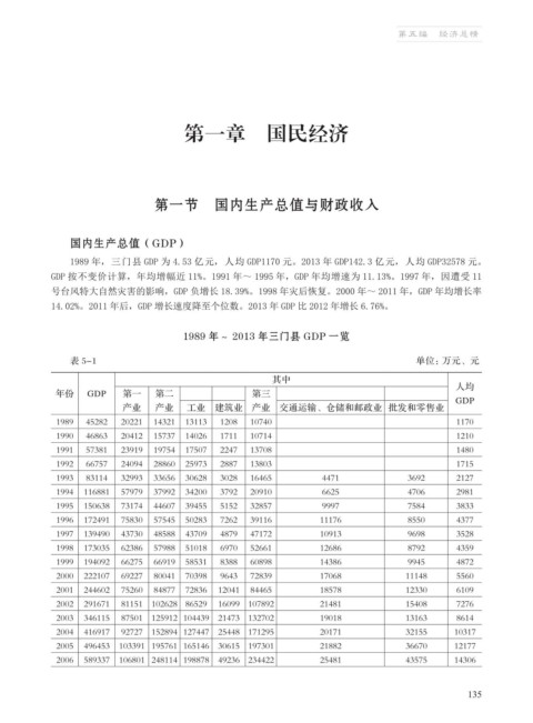 1989 年,三门县 GDP 为 4.53 亿元,人均 GDP1170 元。2013 年 GDP142.3 亿元,人均 GDP32578 元。