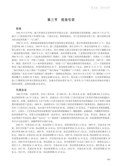 协议利用外资 110.27 万美元。2003 年,县委出台《关于印发三门县引进企业工作责任考核办法的通知》。