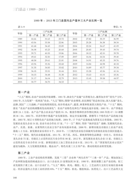 1989 年~ 2013 年三门县国内总产值中三大产业比例一览