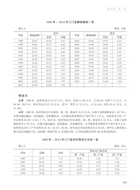 分布 1989 年,农村劳动力中从事农、林、牧、渔业有 16.25 万人,从事工业和建筑业有 1.62 万人,