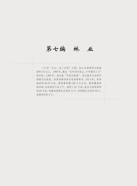 第七编 林 业 三门有“七山一水二分田”之称,低山丘陵面积占陆地 面积 2/3 以上。1989 年,提出“五年消灭荒山,十年绿化三门” 的目标,1994 年,成为省“灭荒合格县”。先后被评为全国平 原绿化先进县、全国退耕还林示范县等称号。2013 年,有林 地面积 96.32 万亩,森林蓄积量 180 万立方米,森林覆盖率 56.63%;自然保护小区 3 个,面积 1.01 万亩;重点公益林面积 36.02 万亩。创建省级绿化示范村 12 个,市级绿化示范村 38 个, 省森林村庄 6 个。