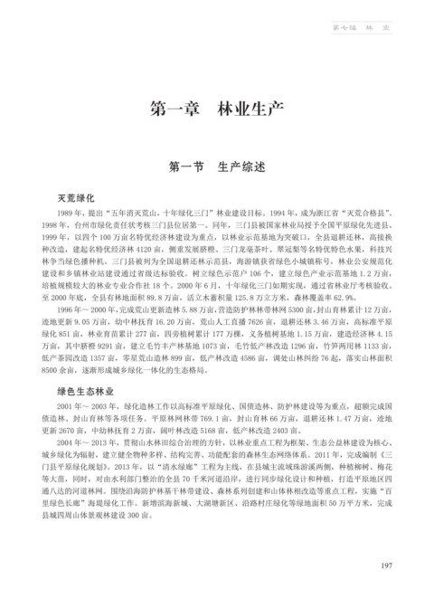 1989 年,提出“五年消灭荒山,十年绿化三门”林业建设目标。1994 年,成为浙江省“灭荒合格县”。