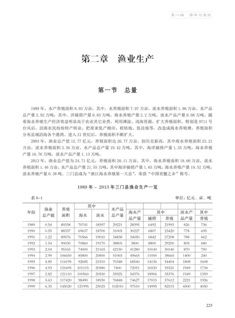 淡水养殖产量 0.38 吨。三门县成为“浙江海水养殖第一大县”,荣获“中国青蟹之乡”称号。