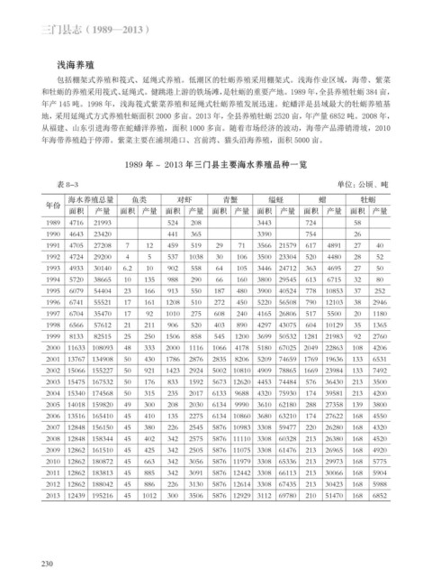 地,采用延绳式方式养殖牡蛎面积 2000 多亩。2013 年,全县养殖牡蛎 2520 亩,年产量 6852 吨。2008 年,