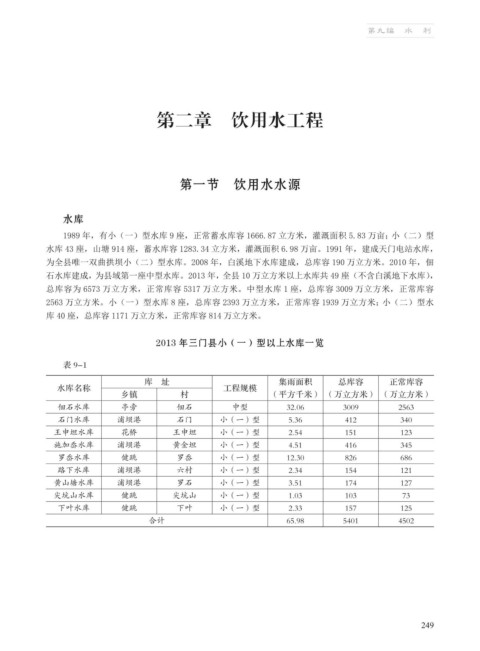 2013 年三门县小(一)型以上水库一览