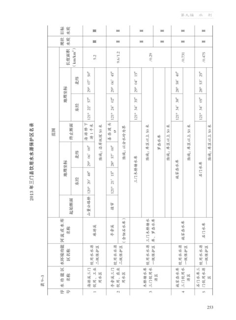 年三门县饮用水水源保护区名录 范围 地理坐标 北纬 海游 29°06′00″ 1 游 沿岸纵深 陆域: 善岙 28°57′00″ 以分水岭为界 陆域: 三门木桥塘水库 库区以上 陆域: 罗岙水库 库区以上 陆域: 施家岙水库 库区以上 陆域: 石门水库 库区以上 陆域: