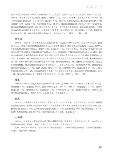 下村河段堤防加固工程,长 1.13 千米,投资 257 万元。2011 年,珠游溪双楼段、独山段河道整治纳入“清