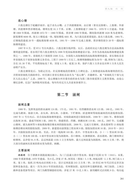 1988 年,发挥效益的排水涵闸 124 座,175 孔。1991 年,有挡潮排涝水闸 123 座,180 孔。1995 年,