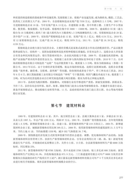 医药化工后的第五大产业。2004 年,全县船舶制造业实现产值 7550 万元,造船吨位 2.5 万吨。2007 年,