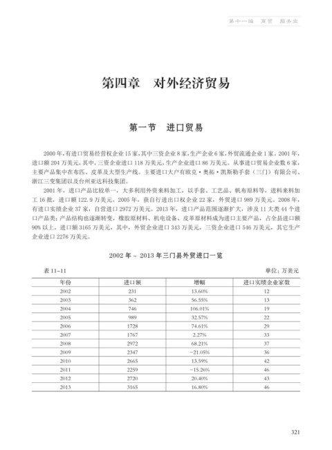 2000 年,有进口贸易经营权企业 15 家,其中三资企业 8 家,生产企业 6 家,外贸流通企业 1 家。2001 年,