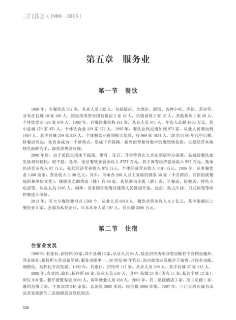 规模化、高档化方向发展。1992 年,有旅社、招待所 117 家,从业人员 298 人,其中县城 37 家 143 人。