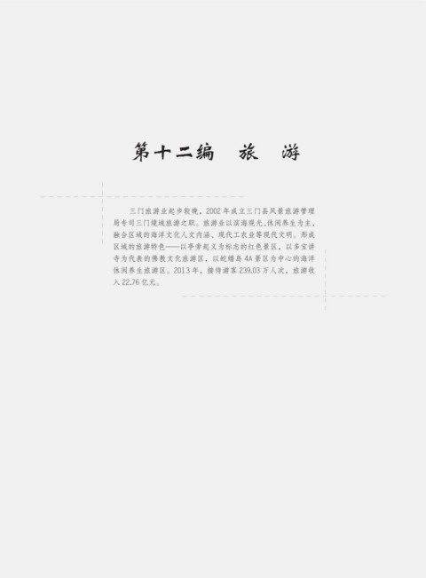第十二编 旅 游 三门旅游业起步较晚,2002 年成立三门县风景旅游管理 局专司三门境域旅游之职。旅游业以滨海观光、休闲养生为主, 融合区域的海洋文化人文内涵、现代工农业等现代文明。形成 区域的旅游特色——以亭旁起义为标志的红色景区,以多宝讲 寺为代表的佛教文化旅游区,以蛇蟠岛 4A 景区为中心的海洋 休闲养生旅游区。2013 年,接待游客 239.03 万人次,旅游收 入 22.76 亿元。