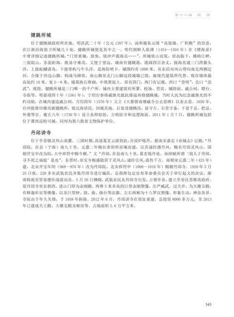 寺庙等。明嘉靖四十年(1561 年),宁绍台参将戚继光抵抗倭寇再修健跳城,当时人民为纪念戚继光的不