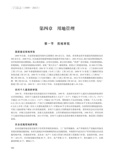 国家和省重点工程用地审批有:2004 年 74 省道三门上枫坑至健跳段改建工程 1178 亩,三门县佃石水库