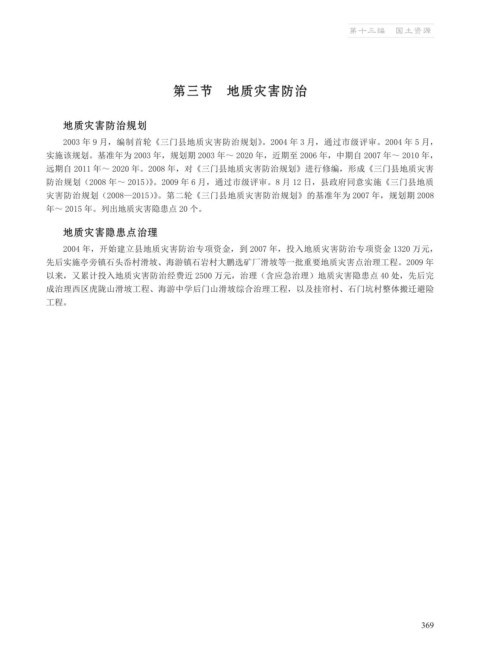灾害防治规划(2008—2015)》。第二轮《三门县地质灾害防治规划》的基准年为 2007 年,规划期 2008