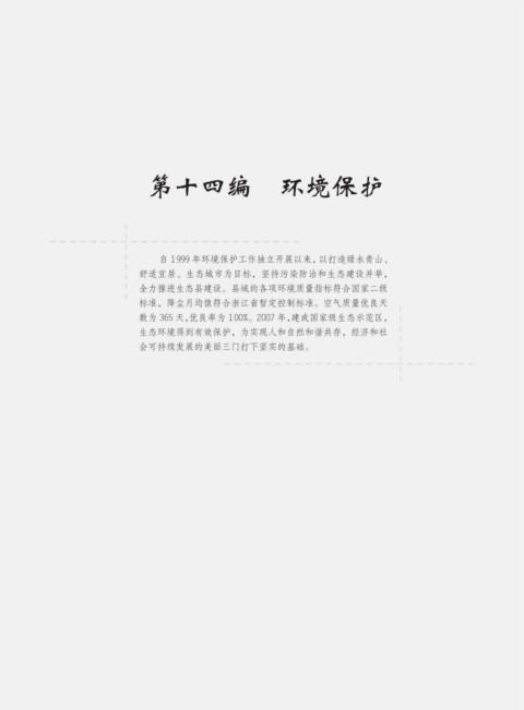 第十四编 环境保护 自 1999 年环境保护工作独立开展以来,以打造绿水青山、 舒适宜居、生态城市为目标,坚持污染防治和生态建设并举, 全力推进生态县建设。县域的各项环境质量指标符合国家二级 标准,降尘月均值符合浙江省暂定控制标准。空气质量优良天 数为 365 天,优良率为 100%。2007 年,建成国家级生态示范区, 生态环境得到有效保护,为实现人和自然和谐共存,经济和社 会可持续发展的美丽三门打下坚实的基础。
