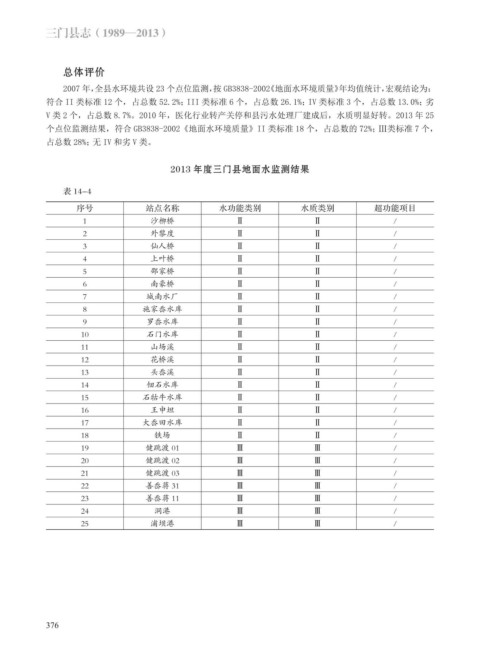 V 类 2 个,占总数 8.7%。2010 年,医化行业转产关停和县污水处理厂建成后,水质明显好转。2013 年 25