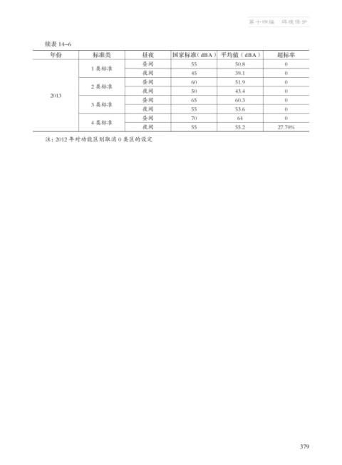 第十四编 环境保护 续表 14-6 年份 标准类 昼夜 国家标准(dBA) 平均值(dBA) 超标率 昼间 55 50.8 0 1 类标准 夜间 45 39.1 0 昼间 60 51.9 0 2 类标准 夜间 50 43.4 0 2013 昼间 65 60.3 0 3 类标准 夜间 55 53.6 0 昼间 70 64 0 4 类标准 夜间 55 55.2 27.70% 注:2012 年对功能区划取消 0 类区的设定 379