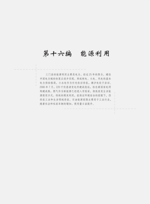 第十六编 能源利用 三门县的能源利用主要是电力,经过 25 年的努力,建设 中国电力城的初衷正逐步实现。形成核电、火电、风电的基本 电力供给格局,小水电作为补充依旧存在,潮汐电处于启动。 2006 年 7 月,220 千伏悬渚变电所建成投运,标志着国家电网 构建成熟。燃气作为新能源已经进入百姓家,彻底改变生活能 源使用方式。传统的煤炭利用,在保证环境安全的前提下,仍 然在工业和生活领域存在。石油能源前期主要用于工业行业, 随着社会和私家车辆的增加,使用量日益提升。