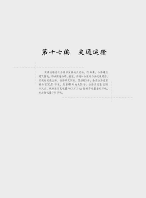 第十七编 交通运输 交通运输是社会经济发展的大动脉,25 年来,公路建设 突飞猛进,形成高速公路、省道、县道和乡道的公共交通网络, 实现村村通公路。铁路从无到有。至 2013 年,全县公路总里 程为 1230.51 千米,是 1989 年的 4.35 倍。公路客运量 1253 万人次,铁路旅客发送量 40.3 万人次;陆路货运量 192 万吨, 水路货运量 745 万吨。