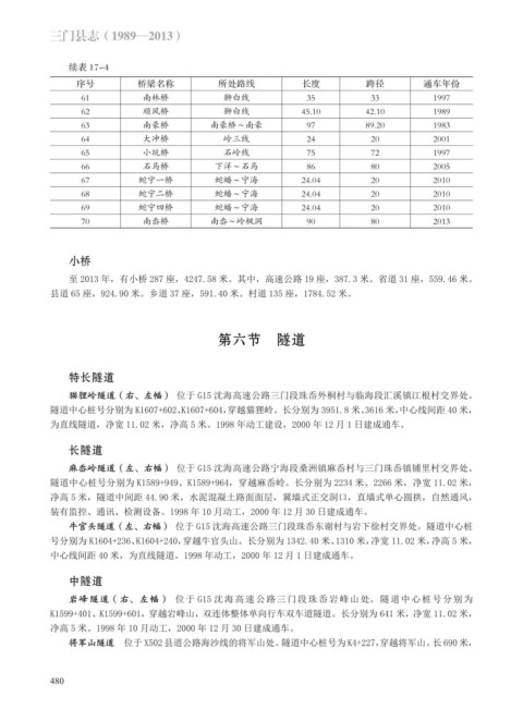 至 2013 年,有小桥 287 座,4247.58 米。其中,高速公路 19 座,387.3 米。省道 31 座,559.46 米。