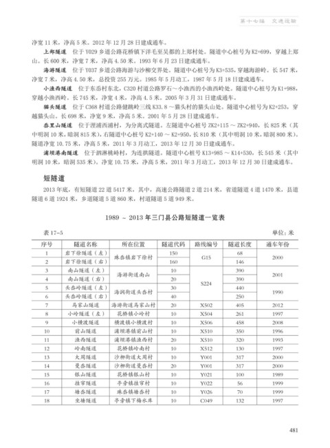 2013 年底,有短隧道 22 道 5417 米,其中,高速公路隧道 2 道 214 米,省道隧道 4 道 1470 米,县道