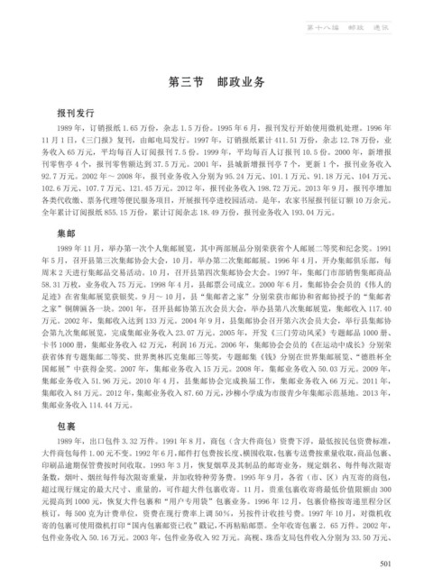 集邮业务收入 51.96 万元。2010 年 4 月,县集邮协会完成换届工作,集邮业务收入 66 万元。2011 年,