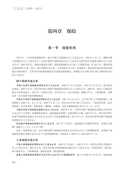 支公司。2000 年以后,保险市场逐步开放,各股份制保险公司入驻三门保险市场。至 2013 年,保险市场