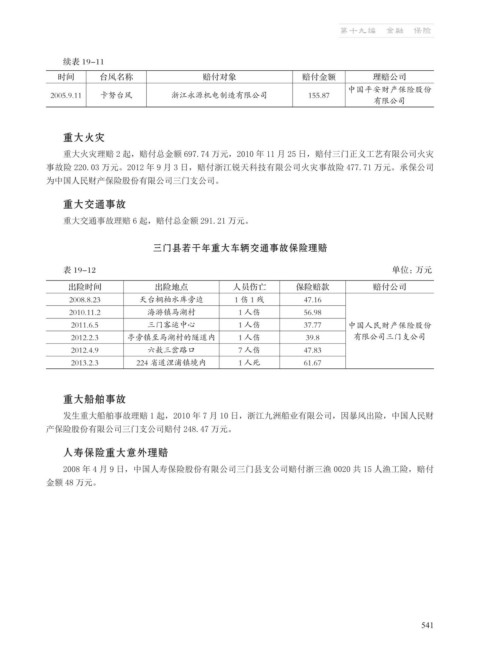 重大火灾理赔 2 起,赔付总金额 697.74 万元,2010 年 11 月 25 日,赔付三门正义工艺有限公司火灾