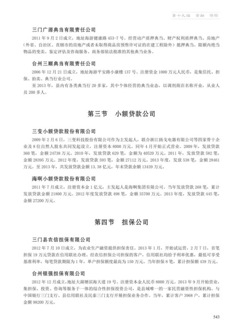中国银行三门支行、县信用联社及民泰三门支行开展担保业务合作。当年,累计客户 3968 户,累计担保