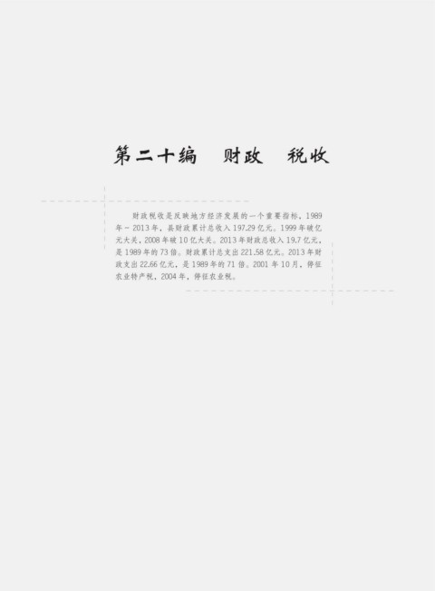 第二十编 财政 税收 财政税收是反映地方经济发展的一个重要指标,1989 年~ 2013 年,县财政累计总收入 197.29 亿元。1999 年破亿 元大关,2008 年破 10 亿大关。2013 年财政总收入 19.7 亿元, 是 1989 年的 73 倍。财政累计总支出 221.58 亿元。2013 年财 政支出 22.66 亿元,是 1989 年的 71 倍。2001 年 10 月,停征 农业特产税,2004 年,停征农业税。