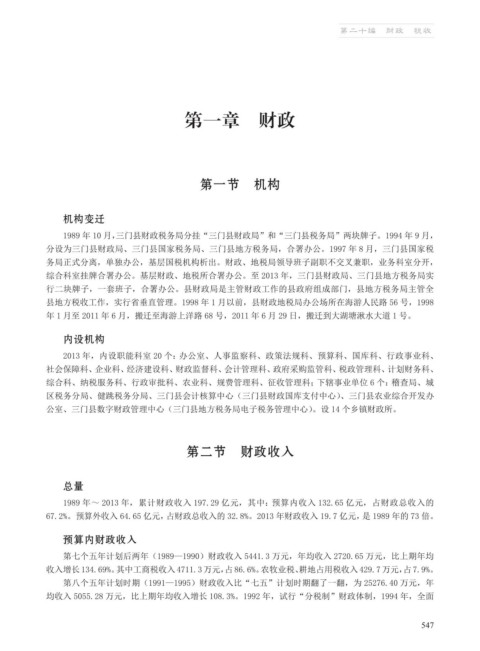 综合科室挂牌合署办公。基层财政、地税所合署办公。至 2013 年,三门县财政局、三门县地方税务局实