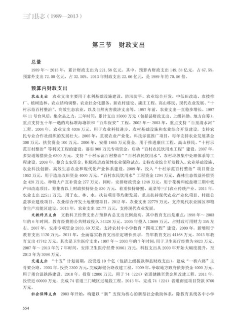 预算外支出 72.00 亿元,占 32.50%。2013 年财政支出 22.66 亿元,是 1989 年的 70.56 倍。