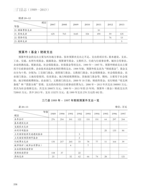 用于行政事业经费、企业技术改造和水利经费的支出。1998 年始,预算外收支改为“财政基金”,基金支