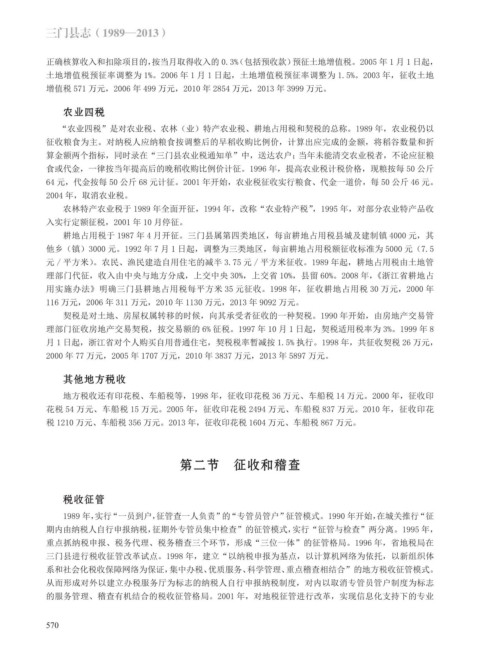 用实施办法》明确三门县耕地占用税每平方米 35 元征收。1998 年,征收耕地占用税 30 万元,2000 年