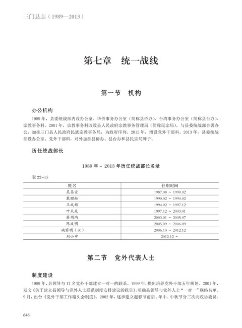公,加挂三门县人民政府民族宗教事务局,为政府序列。2012 年,增设党外干部科。2013 年,县委统战