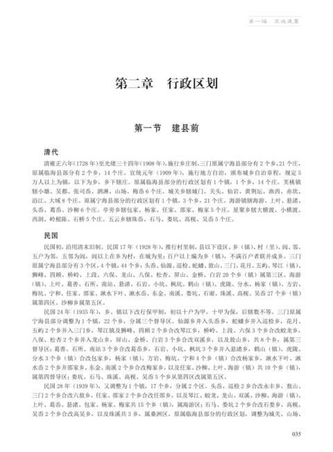 清雍正六年(1728 年)至光绪三十四年(1908 年),施行乡庄制,三门原属宁海县部分有 2 个乡,21 个庄,