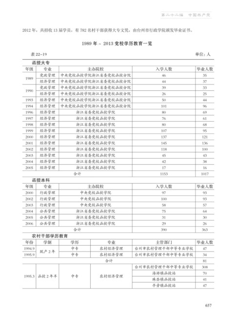 2012 年,共招收 13 届学员,有 782 名村干部获得大专文凭,由台州市行政学院颁发毕业证书。