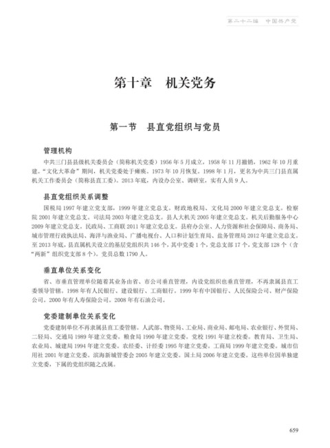 建。“文化大革命”期间,机关党委处于瘫痪。1973 年 10 月恢复。1998 年 1 月,更名为中共三门县直属