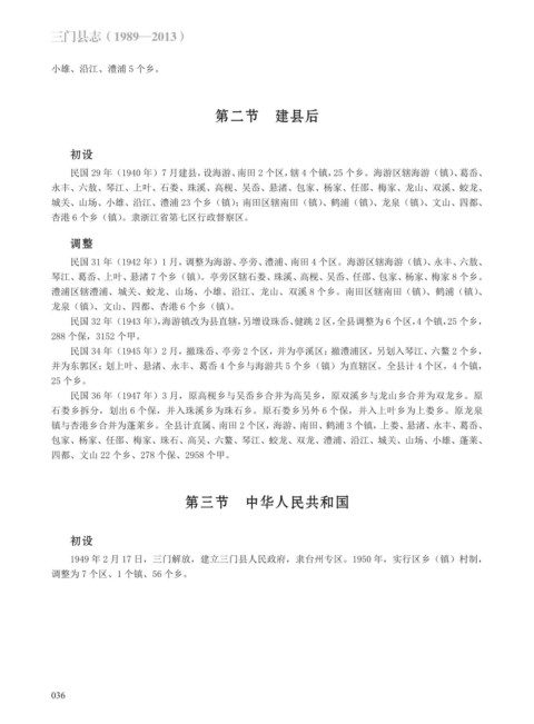 1949 年 2 月 17 日,三门解放,建立三门县人民政府,隶台州专区。1950 年,实行区乡(镇)村制,