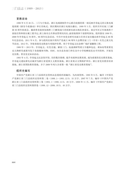 浙江省三门县组织史资料第三卷(1994.1—1998.12)》,29 万字。2008 年 11 月,编印《中国共产党浙江