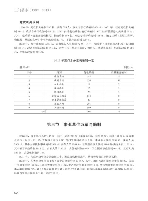 2013 年,有行政编制 1945 名,后勤服务人员编制 77 名。其中,党政群(含垂直管理机关)行政编