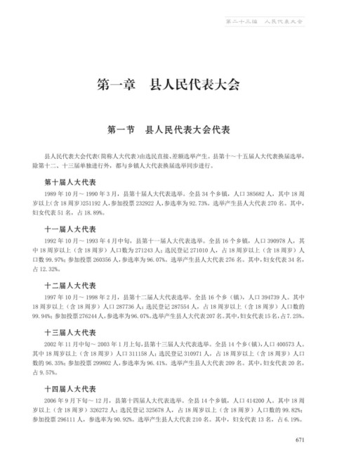 县人民代表大会代表(简称人大代表)由选民直接、差额选举产生。县第十~十五届人大代表换届选举,