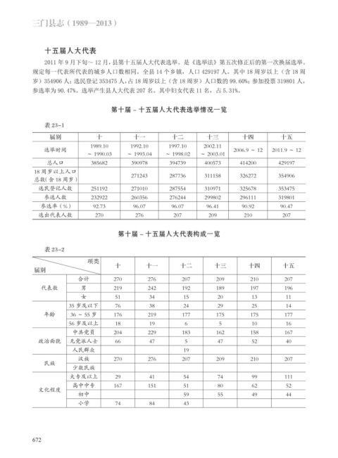 2011 年 9 月下旬~ 12 月,县第十五届人大代表选举。是《选举法》第五次修正后的第一次换届选举。