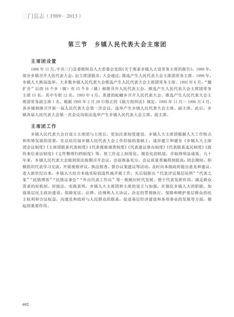 1988 年 11 月,中共三门县委批转县人大常委会党组《关于要求乡镇人大设常务主席的报告》。1989 年,